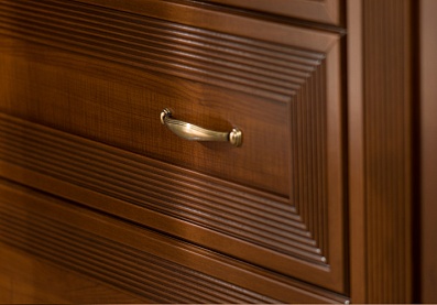 Сдержанная роскошь проявляется в деталях: элегантные латунные ручки, фрезерованные филенки, изящные витые менсолодержатели. Ручное патинирование придает фасадам налет старины, качественное лаковое покрытие устойчиво к выцветанию, не желтеет со временем. Надежная, продуманная фурнитура — петли с доводчиками, накладные демпферы, скрытые направляющие — превращает эксплуатацию гарнитура в истинное удовольствие.